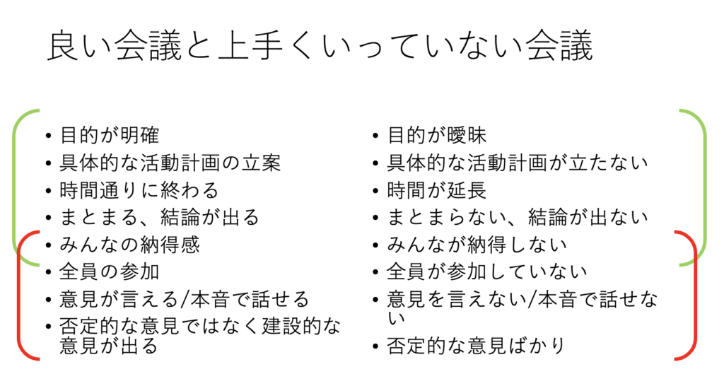 緑で囲んでいる箇所は会議の設計(デザイン)として事前に準備をしておくことができること、赤で囲んである箇所は意見が活発に出やすいように工夫しておく雰囲気作りに近いと考えます。