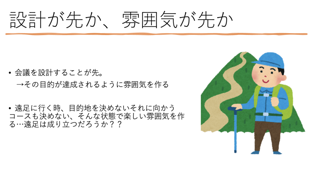 つまり、会議を事前に設計(デザイン)することと、雰囲気作りの2つが大きなポイントであると言えますね。