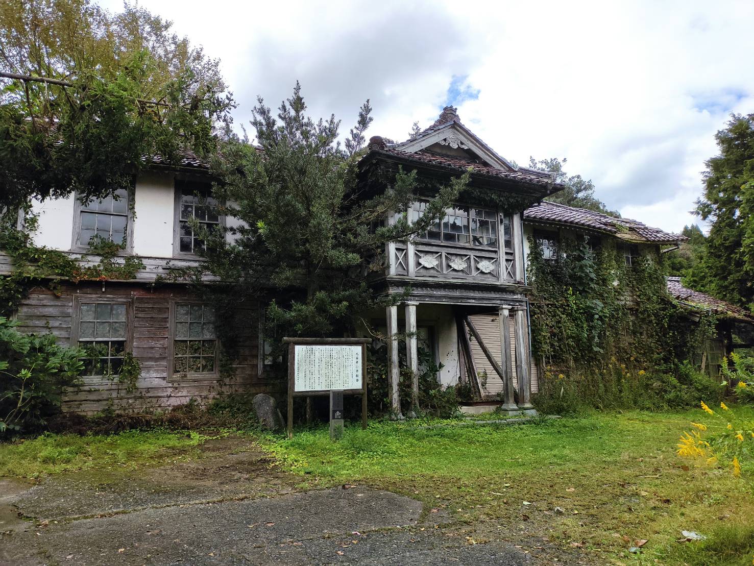 旧岩井小学校は2021年10月現在、屋根は崩れかけ、窓ガラスは割れ、老朽化が進んでいます。